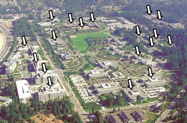 Office moves at Microsoft's Redmond campus are as ubiquitous as overcast skies and traffic on the 405, and several years ago I took an overhead photo of the old main campus and highlighted all the buildings where I'd had a physical office at one time or other.