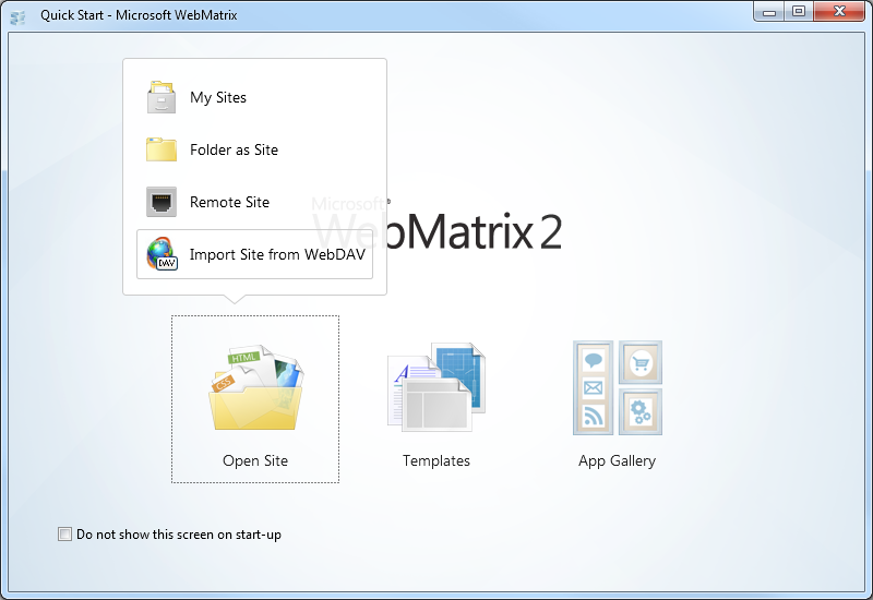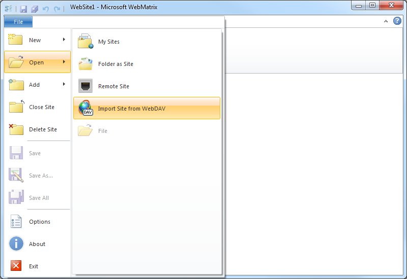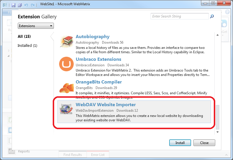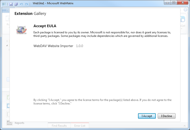 In any event, I was explaining how easy it is to work with WebDAV, and I mentioned that I had written some some blogs about working with WebDAV websites programmatically. (See my Sending WebDAV Requests in .NET Revisited blog for an example.) Since WebMatrix 2 has some pretty cool extensibility, Yishai challenged me to write a WebDAV extension for WebMatrix. His idea was just too good for me to pass up, so I stayed up late that night and I wrote a simple WebDAV Website Import extension for WebMatrix 2.