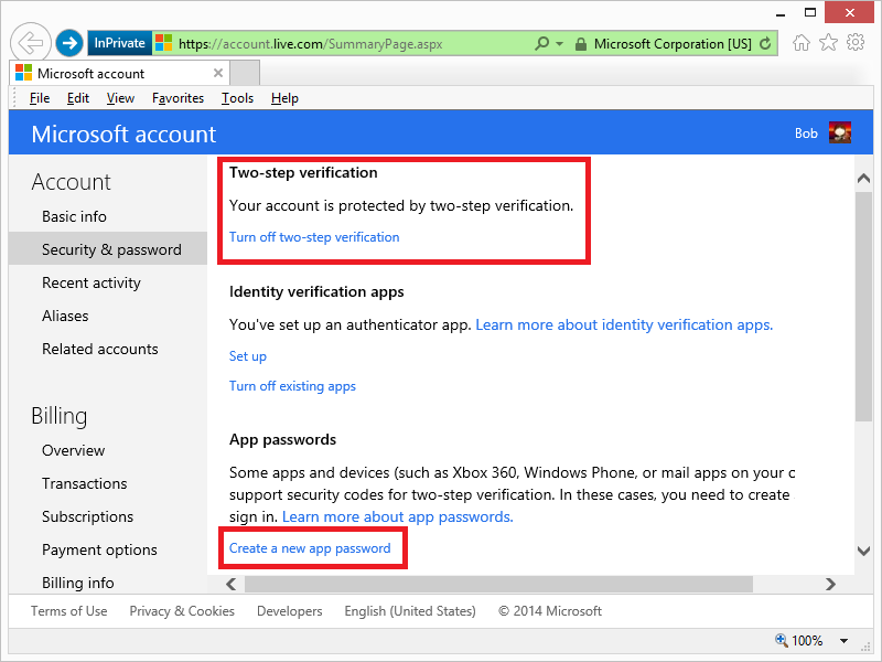 A quick note about two-step verification: enabling this security feature adds an additional requirement so that you will need to use a secondary method to verify your identity when you are logging in. (For example, you can use a phone app, text message, or second email account.) However, you cannot use a secondary login method when you are using the WebDAV Redirector, so you will need to create an application password. (Note: More information about two-step verification for your Microsoft is available in the Two-step verification: FAQ.)