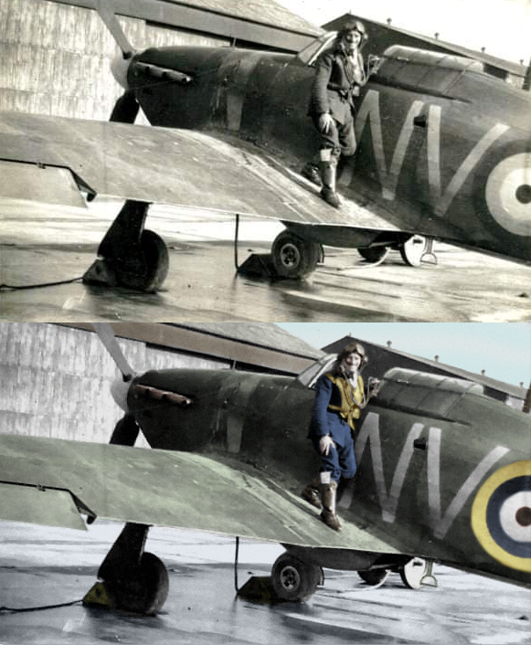 Colorizing that image was quickly followed by colorizing another image, which turned out okay, but I didn't have much to work with; the resolution of the source image wasn't that great. I did some research to get the colors right for the airplane and uniform, so I was trying to learn from my mistakes.