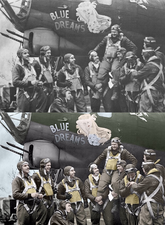 I found another interesting photo in an aviation forum that looked like a good candidate for colorizing, in this case it was the crew of the "Blue Dreams" B-17, which looks like they're celebrating after a successful mission.