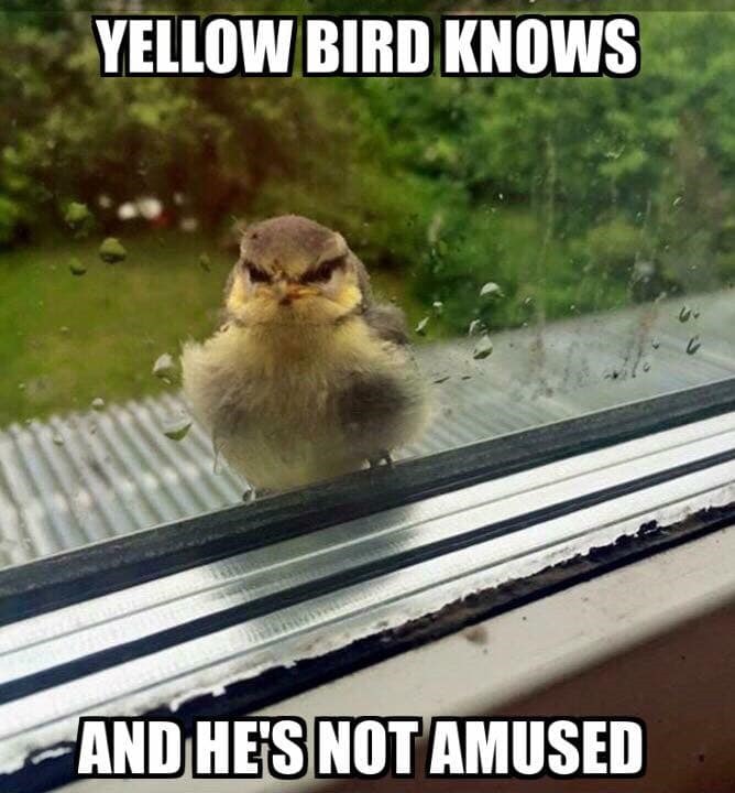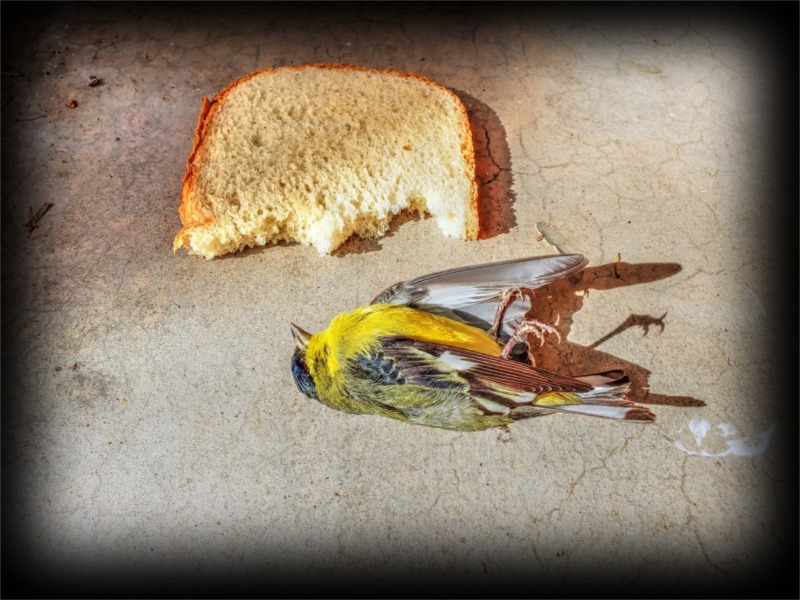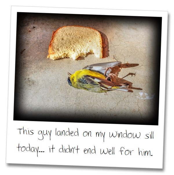 Nevertheless, an unfortunate mishap occurred at my house recently: a tiny yellow bird flew into one of my windows, and - tragically - died as a result. However, when I discovered his demise, my first instinct wasn't to clean up the carnage. Instead, I grabbed my camera and a half-piece of bread and took the following picture, which I uploaded to a veterans' group on Facebook with the caption: "This guy landed on my window sill today... it didn't end well for him."