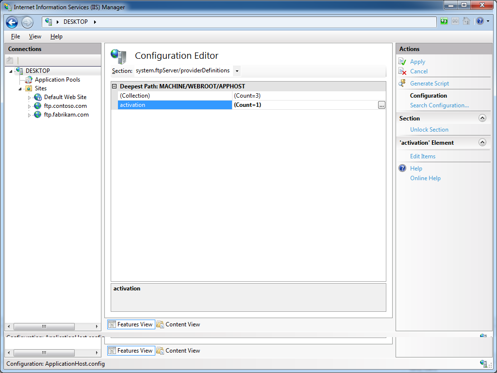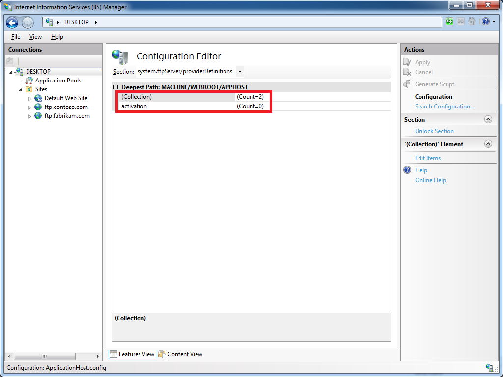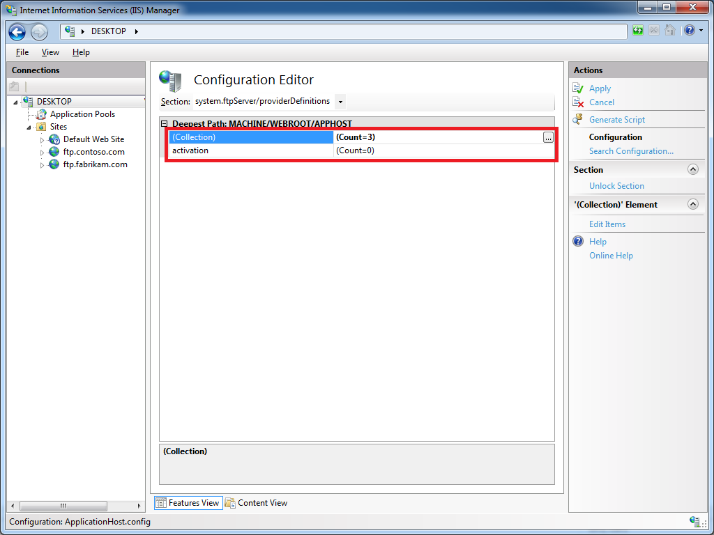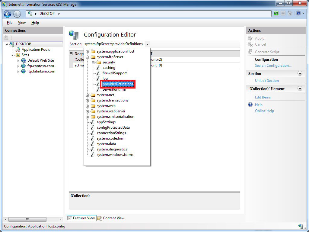 In Part 1 of this blog series about adding custom FTP providers with the IIS Configuration Editor, I showed you how to add a custom FTP provider with a custom setting for the provider that is stored in your IIS configuration settings. For my examples, I showed how to do this by using both the AppCmd.exe application from a command line and by using the IIS Configuration Editor. In part 2 of this blog series, I will show you how to use the IIS Configuration Editor to add custom FTP providers to your FTP sites.