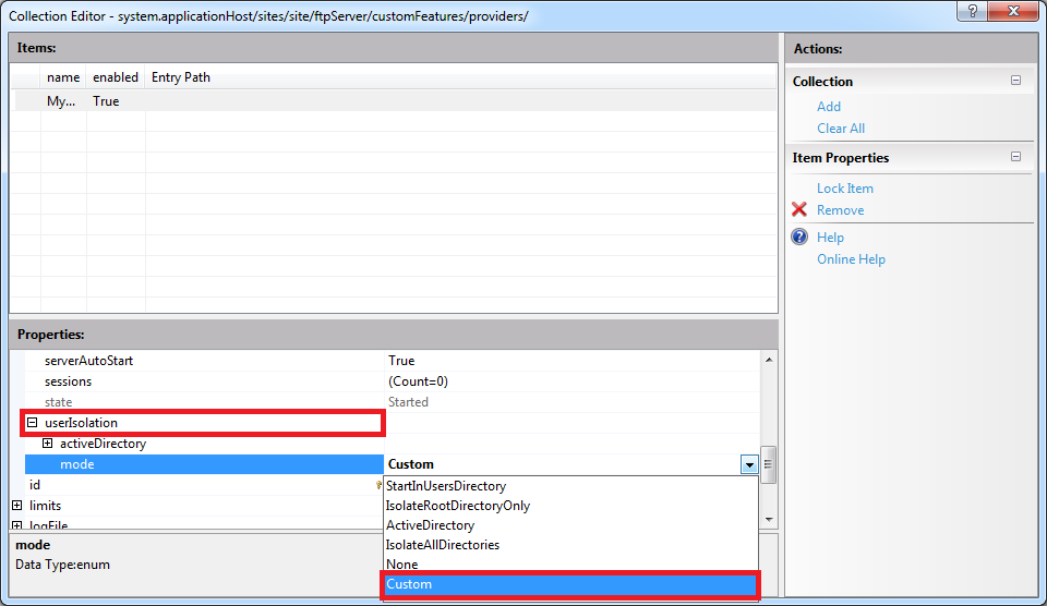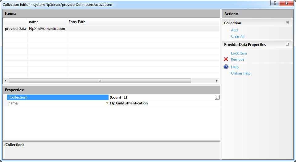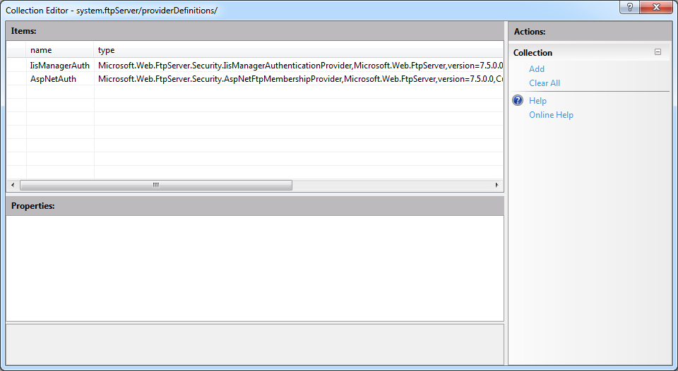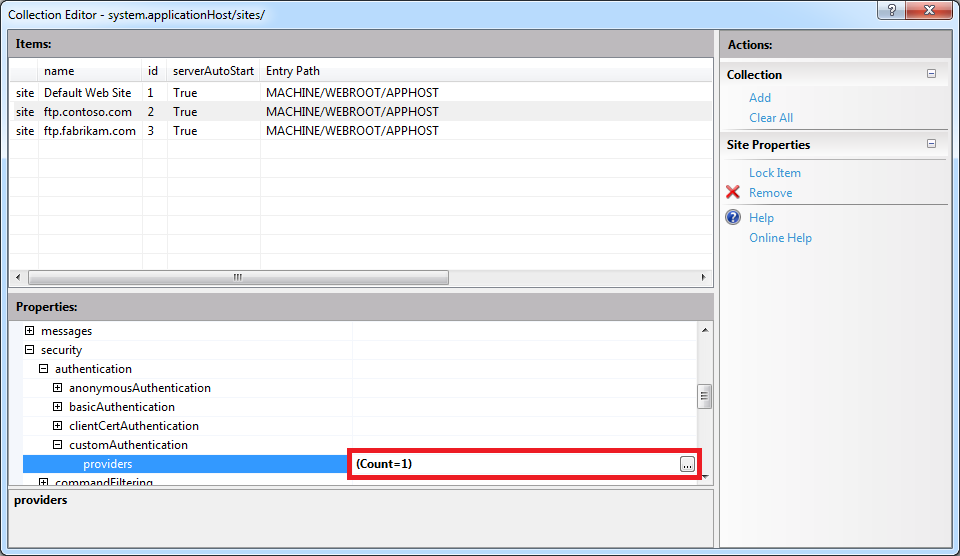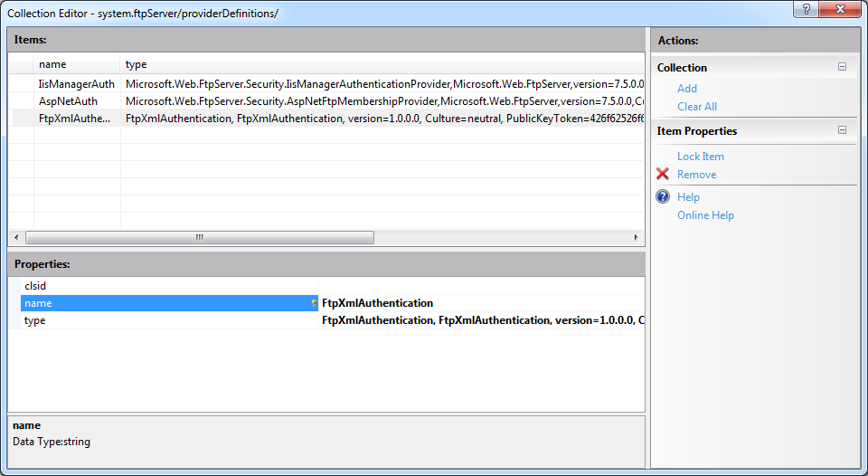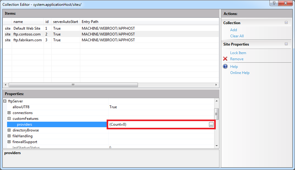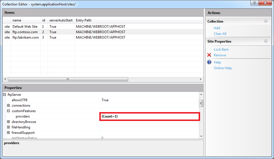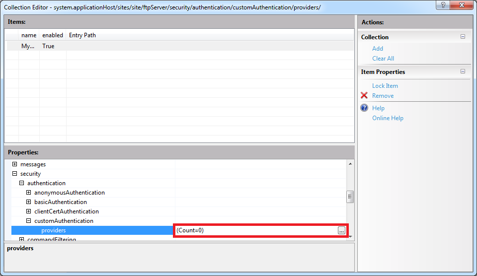 As I mentioned earlier, you will notice that the settings for FTP custom providers are stored in different sections of the ftpServer collection depending on whether they are used for authentication or some other purpose.