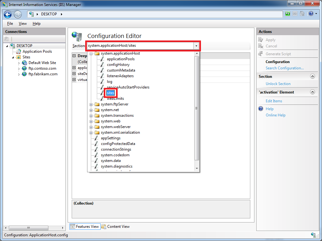 Click the Section drop-down menu, expand the the system.applicationHost collection, and then highlight the sites node: