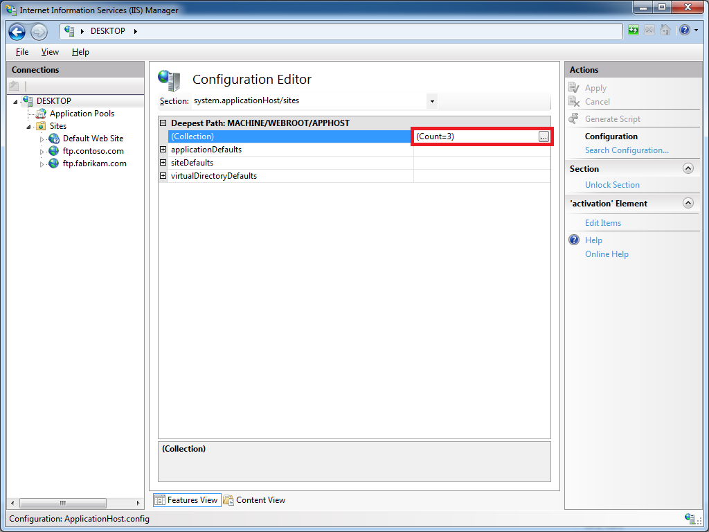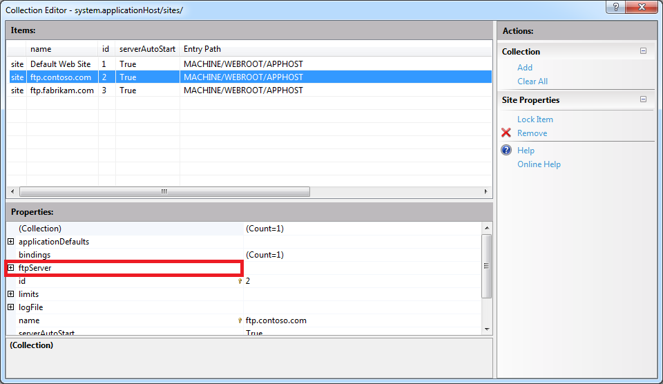 When you click the ellipsis [...], IIS will display the Collection Editor dialog box for your sites; both HTTP and FTP sites will be displayed: