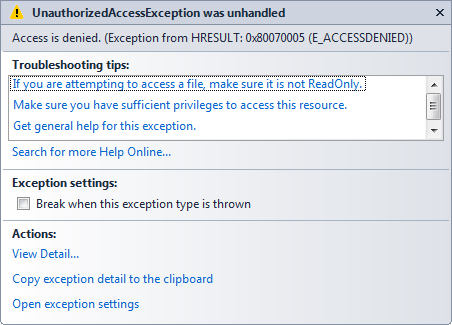 Unhandled Exception: System.UnauthorizedAccessException: Access is denied. (Exception from HRESULT: 0x80070005 (E_ACCESSDENIED))