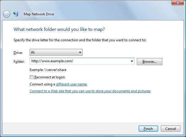 If you prefer, you can also use the command-line to map a drive to a WebDAV site: