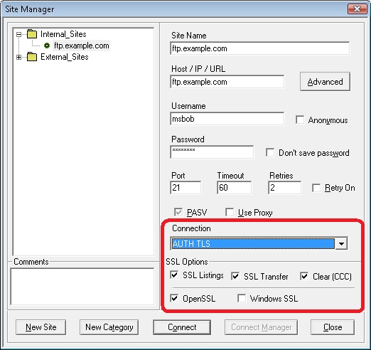Once you have the security options specified for the connection, connecting to an FTP site using FTPS is pretty straightforward.