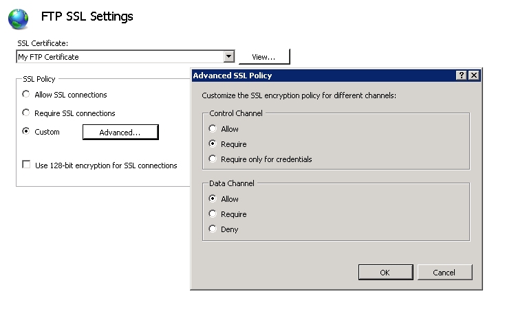 The FTP service for Windows Server 2008 allows customized settings for both the command/control channel and the data channel through the Advanced SSL Policy dialog: