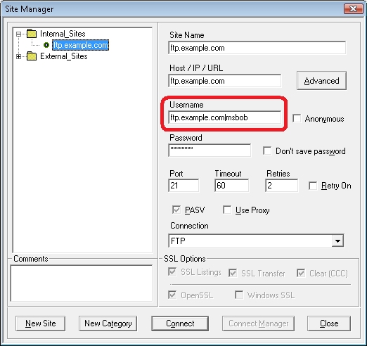 In any event, FTP7 virtual hosts are supported by using the "ftp.example.com|username" syntax when specifying your username, and when you connect to the FTP7 server it will route your requests to the correct FTP virtual host site. The following example shows what that might look like: