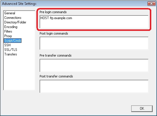A really great feature of Core FTP LE is the ability to send pre-login commands, and since this feature allows you to enter custom commands you can specify the actual FTP HOST command as part of your login: