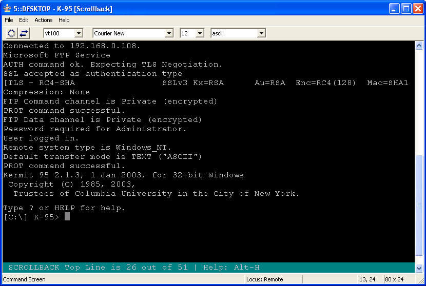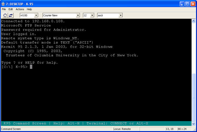 Once you connect, however, the Kermit GUI is just a wrapper for command-line FTP functionality - so you have to know what you're doing in FTP to get around, and there is no explorer-style functionality like you get with graphical FTP clients like Core FTP or FileZilla.