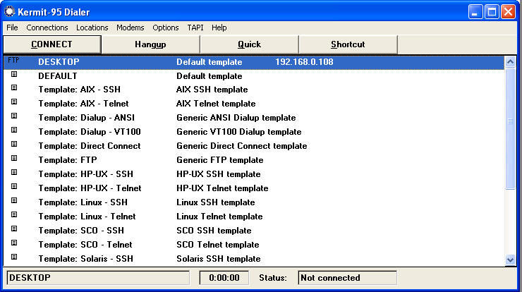 I need to stress here the Kermit is actually a full suite of connectivity applications, the Kermit FTP Client is only one part of that communications suite. So from the outset the Kermit is more than overkill if you're just looking to transfer some files to and from your FTP site. The Kermit Dialer takes the place of what most FTP clients would have as a Site Manager, and opening that application will display a large number of templates for various connection types.