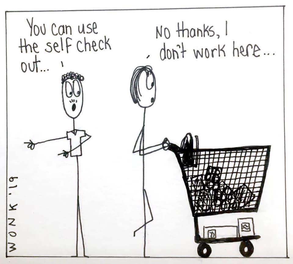 Personally, I'd rather not have to put up with any of that. Nor would I prefer to endure having to interact with a cashier who clearly cannot stand their job and is questioning every life decision that led to their current station in life. Nor would I like to pay more than what I deem as necessary to buy my prepackaged, ready-to-eat sustenance.