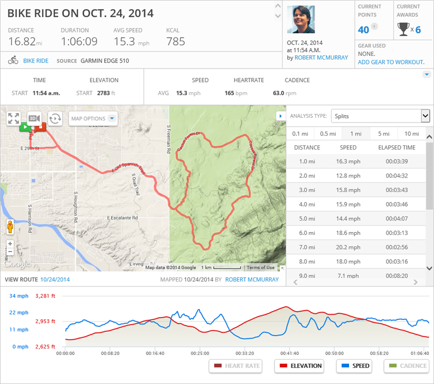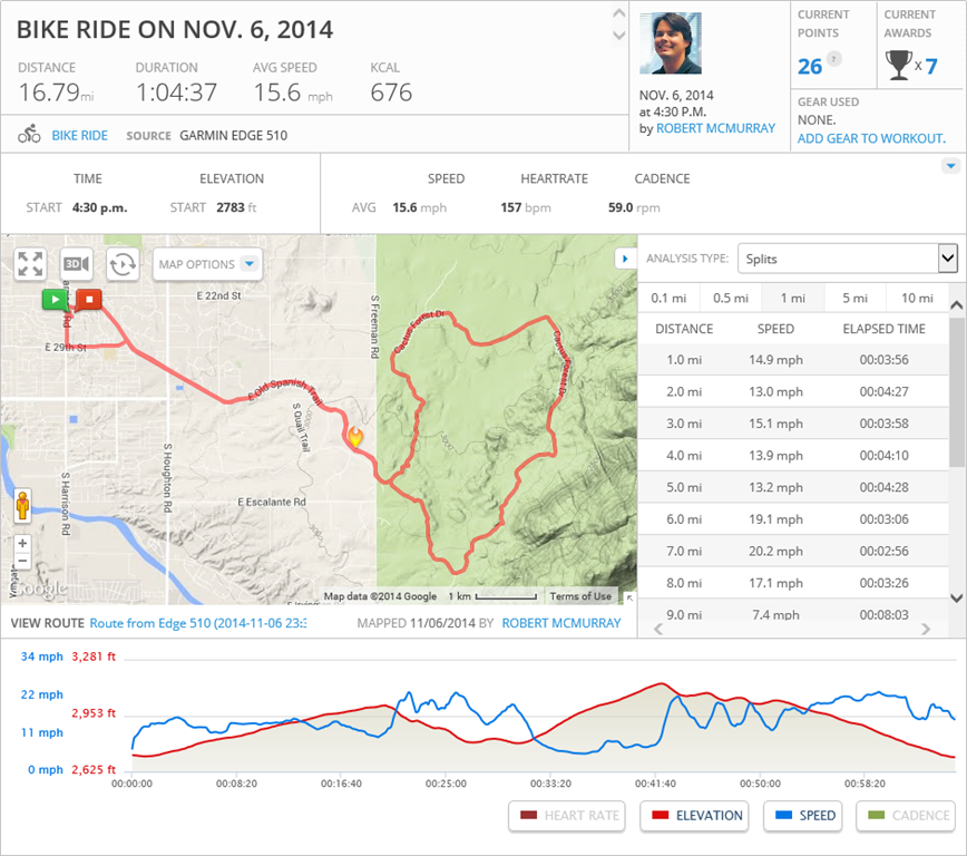 I spent a lot of the time riding through the park focusing on hill training skills; for example, keeping my cadence higher by downshifting earlier. The big hill on Riparian Ridge pushed my heart rate higher than normal, as it always does, but for the most part my heart rate stayed below 160bpm.