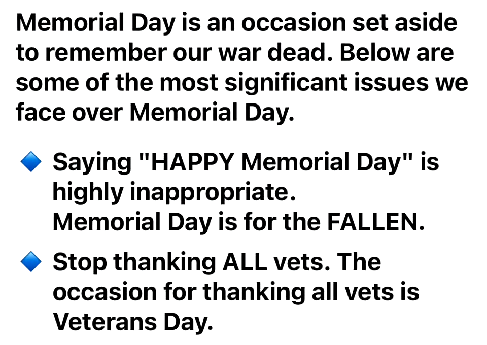 However, while I agree that we should NEVER utter the words "Happy Memorial Day" because they dishonor the meaning of that holiday, we can ALWAYS thank our veterans - whether it's Memorial Day, or Veteran's Day, or Independence Day, or Mother's Day, or Christmas Day, or a Tuesday, or a Friday, or any day that ends in "day."