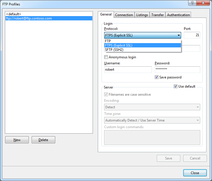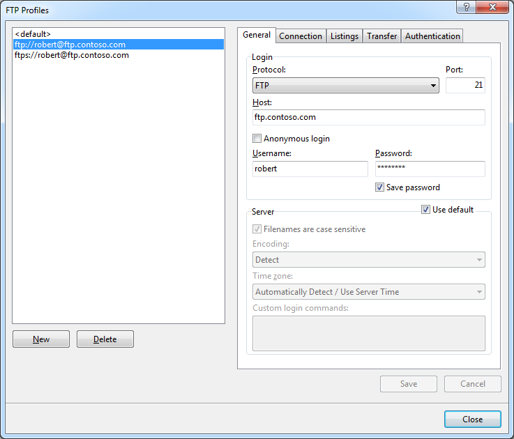 Inside the FTP Profiles dialog, you can specify a wealth of connection options for remote FTP sites that you would expect to find in any other FTP client.