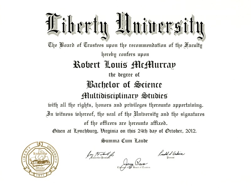 In the end, I finished all of my courses at Liberty University in just over two years - and I managed to maintain a 4.0 GPA throughout my studies, thereby graduating Summa Cum Laude. (Which is probably Latin for "You really need to get a life.")