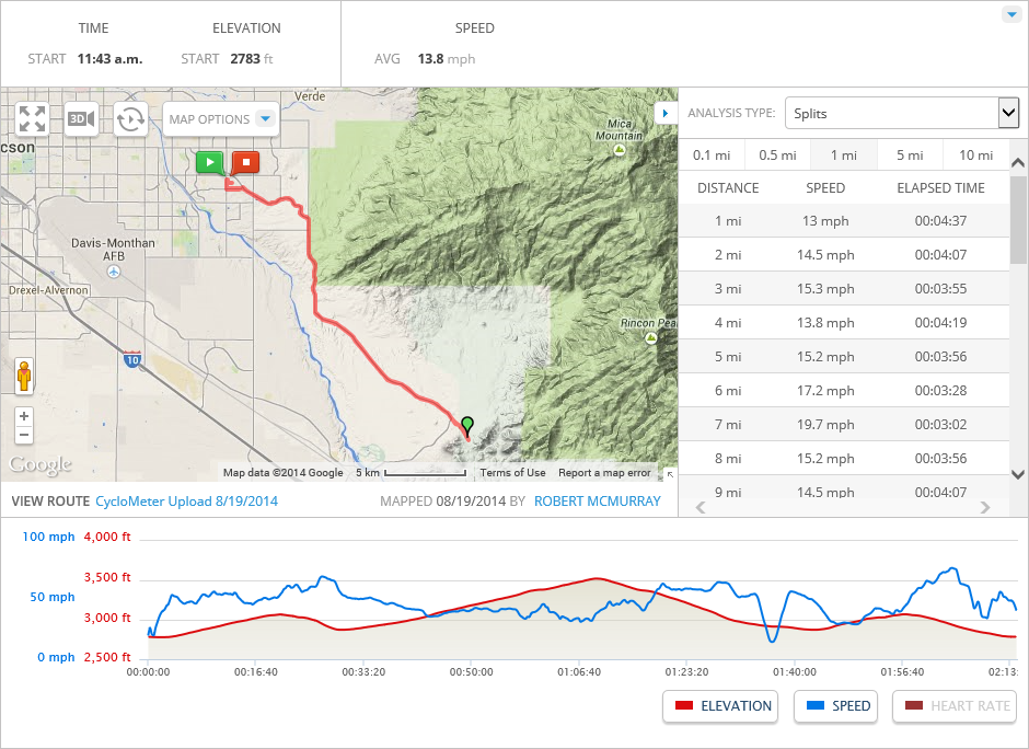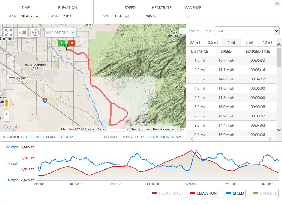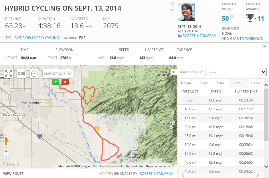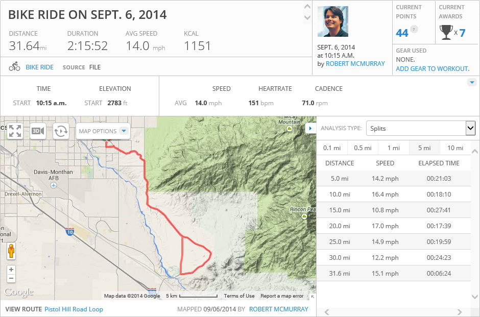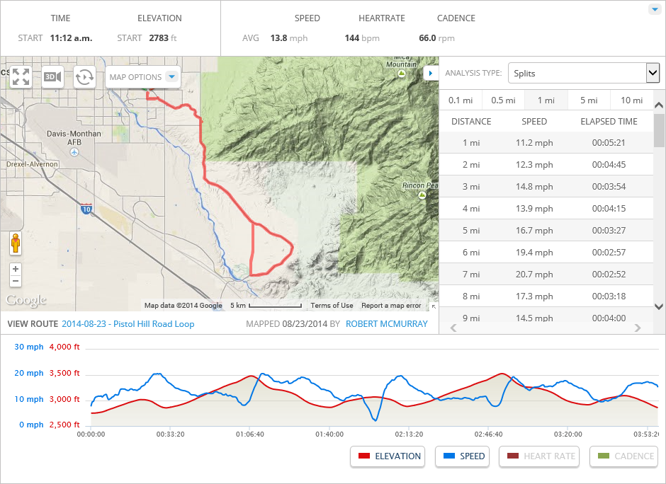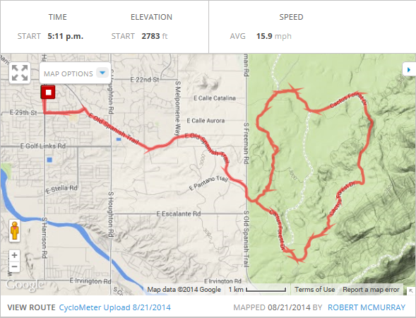 For the future, I’m looking into making a small change to this ride: instead of riding all the way to Colossal Caves on Old Spanish Trail, I can turn off onto Pistol Hill Road (I love the name!) about a mile before the caves, then turn onto Camino Loma Alta, which will take me back to Old Spanish Trail. This adds a few miles to the ride, and it cuts out the barely-maintained last mile to the caves (which hurts to ride). I seem to be the only cyclist who is riding all the way to the caves, so I’m pretty sure that all of the other cyclists are using this alternate route. If I combine that route with my current plan of riding twice to the caves, I might be able to extend the ride to 60 miles.