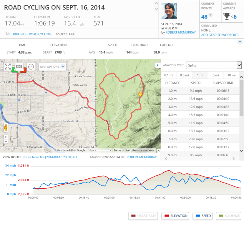 With that in mind, I worked it into our budget to replace my hybrid with a dedicated road bike, and I switched from toe clips to cleats. Today was my inaugural ride with my new road bike, and I chose to ride my usual 17-mile course from my house through the Saguaro National Park (SNP) and home again. I'm still building up my confidence on the bike, so it seemed as though I was riding slower than I would normally ride while I got used to the feel and controls of the new bike. But that being said, I still managed to complete the SNP loop 2¾ minutes faster than my previous personal best.