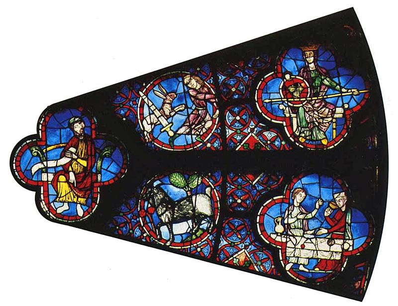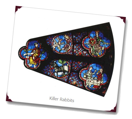 For those of you who thought that the killer rabbit in Monty Python's "Holy Grail" was a work of fiction, I suggest that you see the top center pane in this stained glass detail from the West Rose Window of Notre Dame in Paris. Apparently brutal bunnies must have been an issue when the French built this cathedral, or perhaps the French will run away from anything.