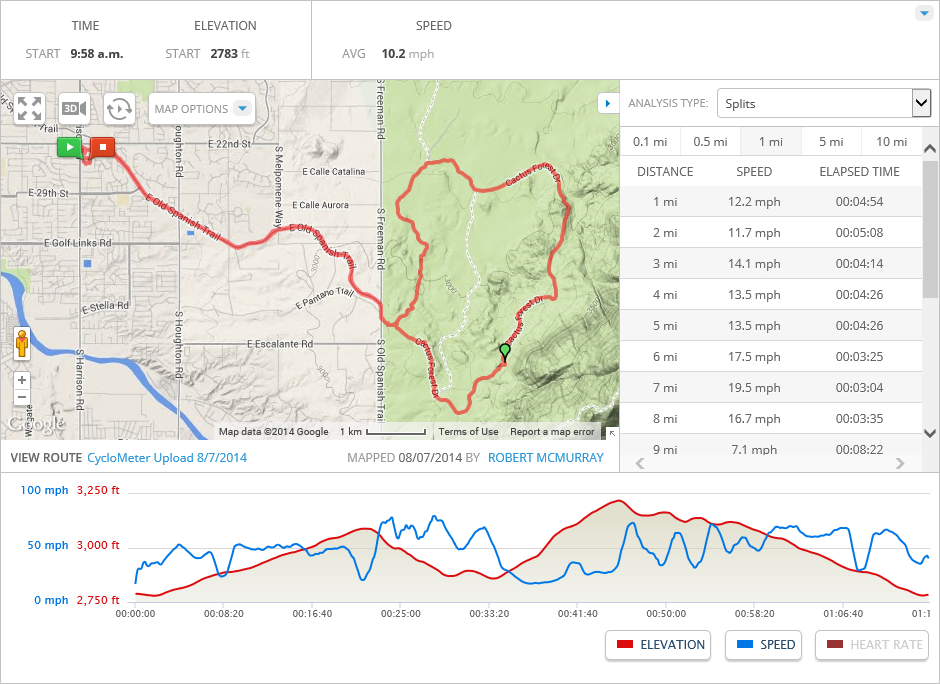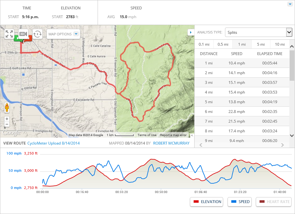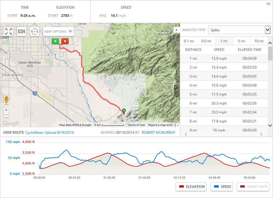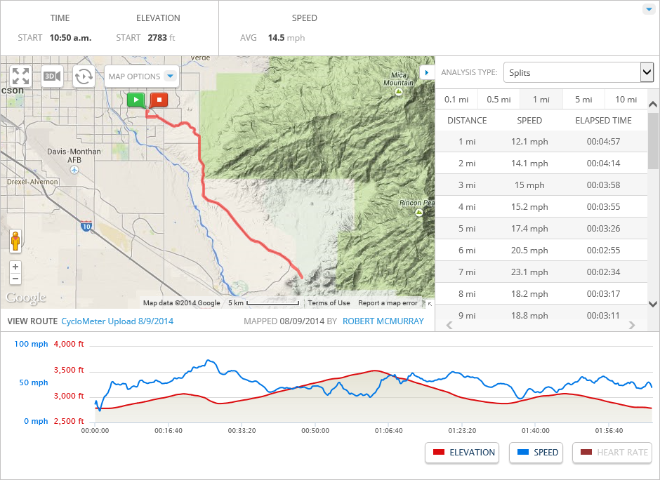 For the future, I’m looking into making a small change to this ride: instead of riding all the way to Colossal Caves on Old Spanish Trail, I can turn off onto Pistol Hill Road (I love the name!) about a mile before the caves, then turn onto Camino Loma Alta, which will take me back to Old Spanish Trail. This adds a few miles to the ride, and it cuts out the barely-maintained last mile to the caves (which hurts to ride). I seem to be the only cyclist who is riding all the way to the caves, so I’m pretty sure that all of the other cyclists are using this alternate route. If I combine that route with my current plan of riding twice to the caves, I might be able to extend the ride to 60 miles.