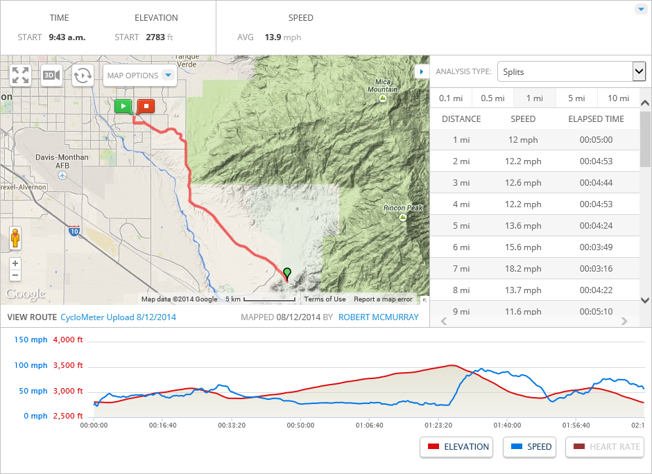 There was a bad headwind on my way back, and that undoubtedly added a few minutes to the ride, which was unfortunate because I was striving for an even two-hour ride for the 30-mile distance from my house to the caves and back, but I arrived home 8 minutes behind that schedule. Not for lack of trying, though. For example: a guy passed me around the 20-mile mark, but I was able to catch him over the next six miles as we got to the part of the ride which meanders uphill from Jeremy Wash. He turned off into Saguaro National Park as I continued homeward, so it's entirely possible that he was reserving his strength for the "Widow Maker" hill in Saguaro National Park around the 3.5-mile mark. I ran out of water when I was about 1.5 miles from my house, which wasn't too bad. I knew that I was close and I had a bottle of Gatorade waiting for me in the fridge, so I didn't attempt to hold anything in reserve.