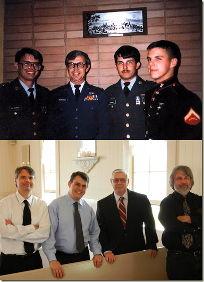 Here are a pair of photos of my dad and brothers with me, and there is a difference of 25 years in between the two images. I stumbled across the second image as I was going through some old photos, and it was taken in 2011 at my daughter's wedding. The first image I have posted on Facebook before, and that photo was taken in 1987. It's kind of amazing to see what the passage of time does...