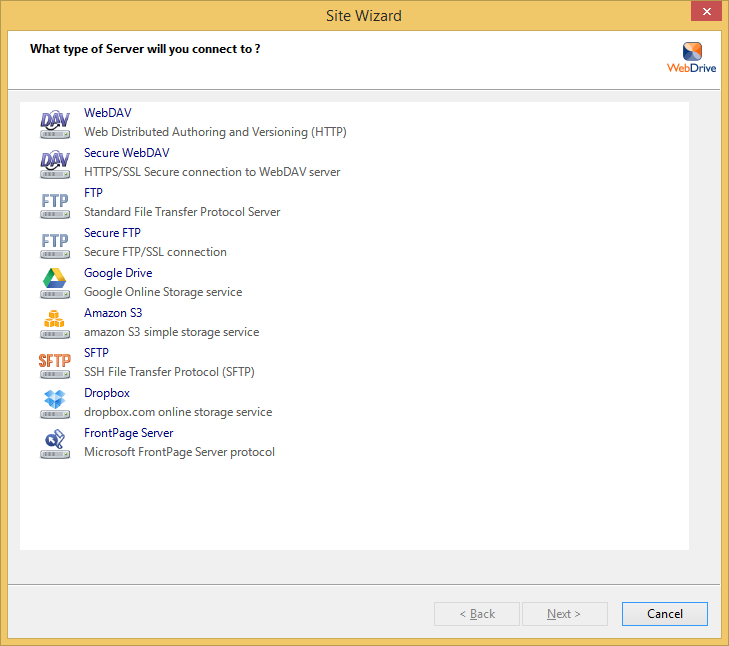 As you can see from the illustration above, WebDrive's list of support technologies is quite extensive: WebDAV, Secure WebDAV, FTP, Secure FTP, Google Drive, Amazon S3, SFTP, Dropbox, and FrontPage Server Extensions.