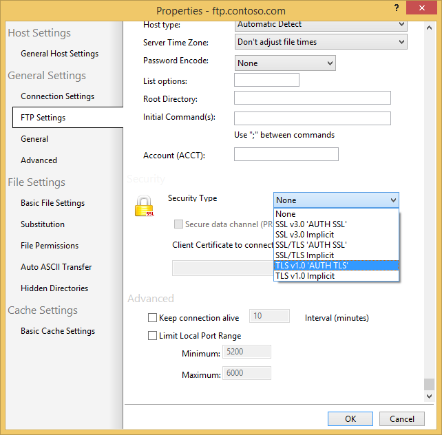WebDrive 12 has built-in support for FTP over SSL (FTPS), and it supports both Explicit and Implicit FTPS. To specify which type of encryption to use for FTPS, you need to choose the appropriate option from the Security Type drop-down menu in the FTP Settings for a site: