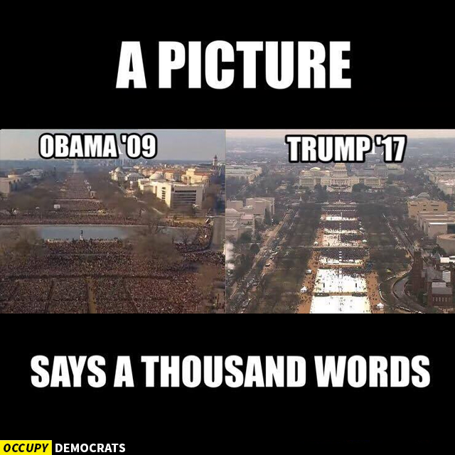 This is a perfect example of "Fake News" in action; the two photos in this image are taken from opposite sides of the mall in order to exaggerate the crowd sizes. In addition, there is no indication that they were taken during the same hour of the respective inauguration ceremonies; the photo from 2009 might be an hour after the ceremony began, and the photo from 2017 might be an hour before the ceremony began. We have no context, but considering the source (the O.D. website) and the fact that the photos were already falsely utilized in order to support an opinion rather than an accurate portrayal of the facts, it's pretty easy to dismiss this image. And yet, I have seen dozens of people posting this image to Facebook with comments of overwhelming approval.