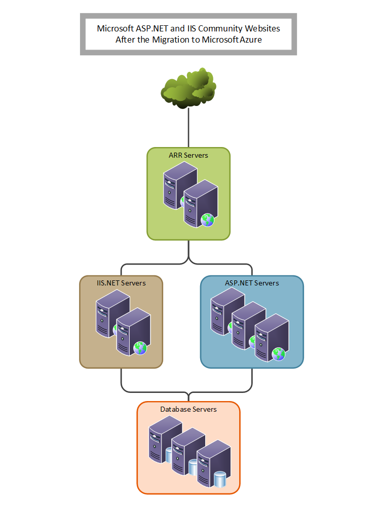 After the migration, Microsoft had reduced both the hosting costs and the number of servers required by almost 50%. Here's what the web farm looked like when the migration had been completed: