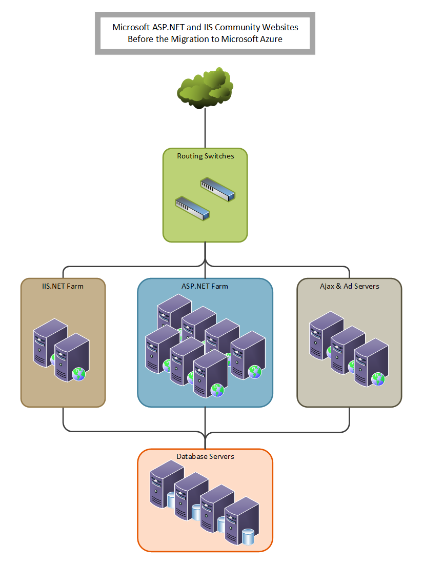 Here's a little background information on this migration case study: last fall Microsoft worked with two of it's hosting partners, Neudesic and Orcsweb, to migrate the www.asp.net and www.iis.net websites from a traditional web hosting scenario (e.g. websites hosted on physical servers) to virtual machines that are hosted in the cloud on Microsoft Azure. Here's what the web farm looked like before the migration: