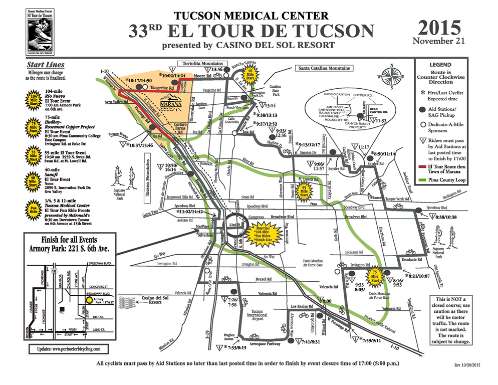 A year has passed since my last adventure riding in the El Tour de Tucson, so it was time for this year's ride. 2015 marked the 33rd anniversary of this annual event, and once again I signed up to ride the full 104 miles. If I was going to subtitle this years ride, I would call it "The Ride That Almost Wasn't," but I'll explain what I mean by that a little later.