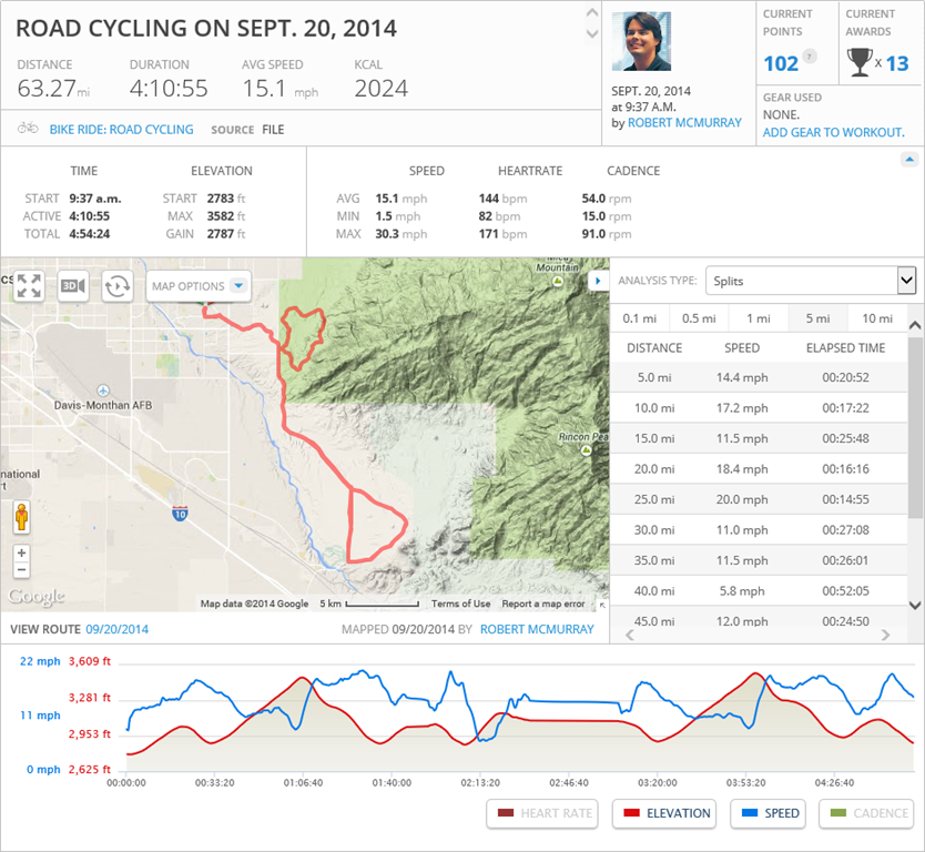 The first pass around PHRL was not that bad; the new bike definitely helps with the hill climbing, and switching from toe clips to cleats has helped tremendously as well. (No more toe pain, and more climbing power.) In fact, I completed this 63-mile ride on my new road bike in 28 minutes less than my last ride on my hybrid bike.