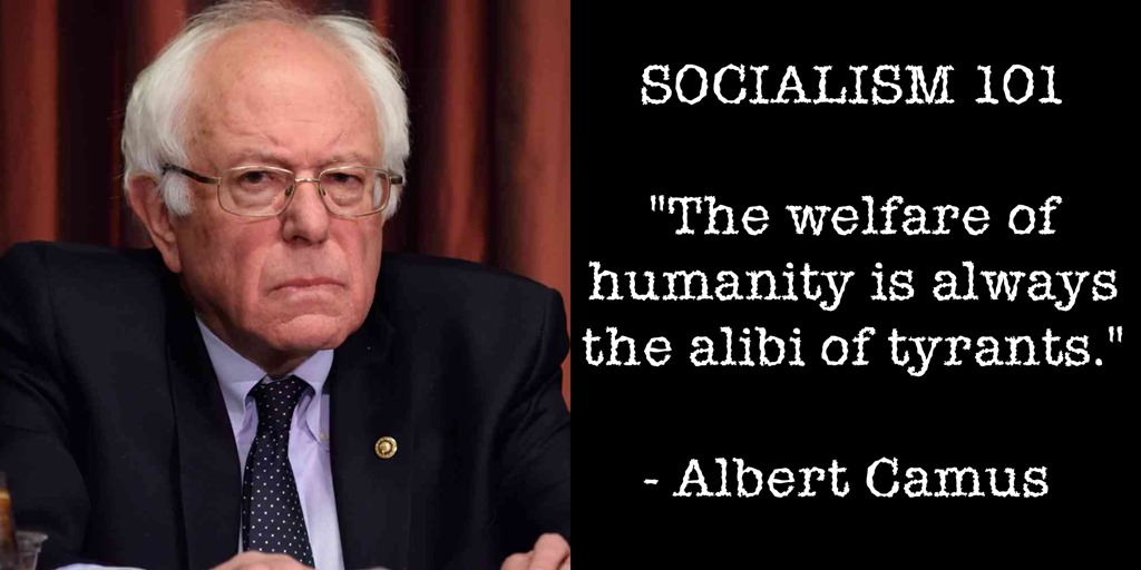 Having said all of that, let's tale a quick look at Bernie; here is a man who has consistently praised Communists like Castro for his social policies, while completely ignoring the hundreds of thousands who that same leader and those same policies put to death. This is why many people believe that it is by no coincidence that Bernie is such a strong advocate for gun control, because in every failed Socialist society, one of the first steps to domination has been to disarm the public. I am no conspiracy theorist, so I do not subscribe to alarmist conjecture. However, I am not blind to history, either. Bernie's proclamations - and those of his devotees - follow a very dangerous pattern, which is summarized in the initial meme that launched this discussion, which I will restate here with a little more context since I think Camus' second point is also apropos to this discussion: "The welfare of the people in particular has always been the alibi of tyrants, and it provides the further advantage of giving the servants of tyranny a good conscience."