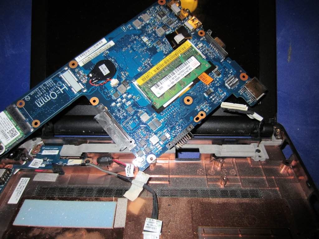 ...once you remove remove the palm rest bracket, you can flip over the motherboard and replace the RAM.